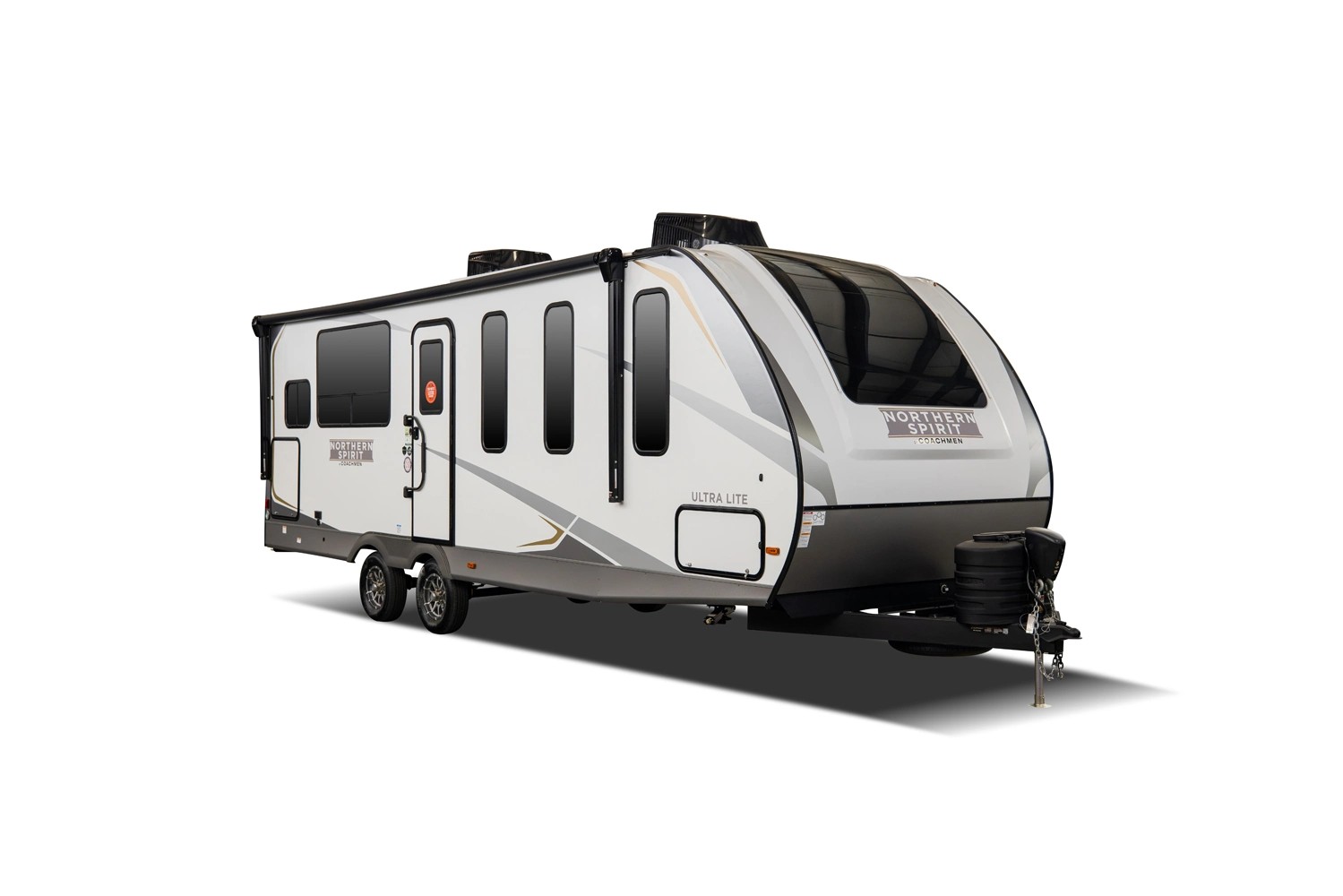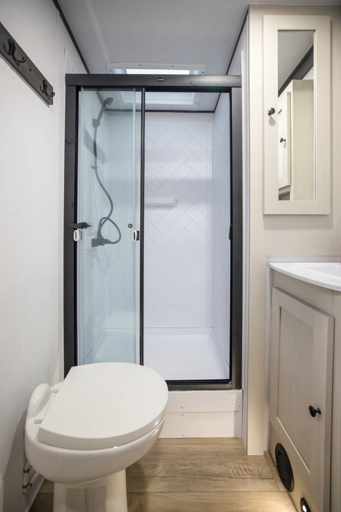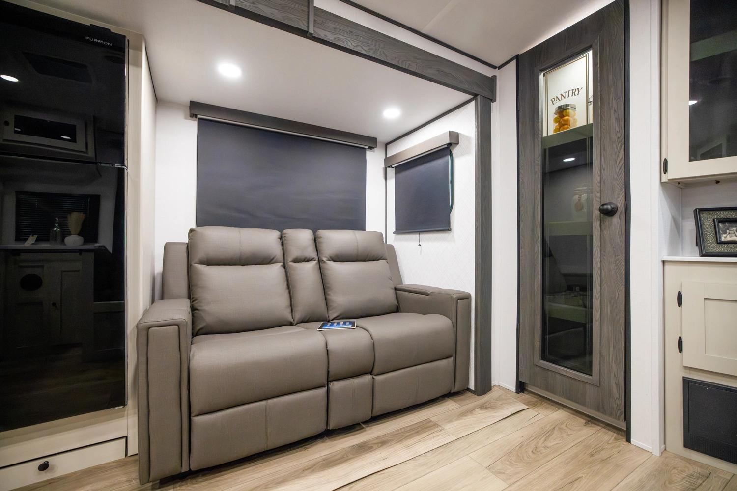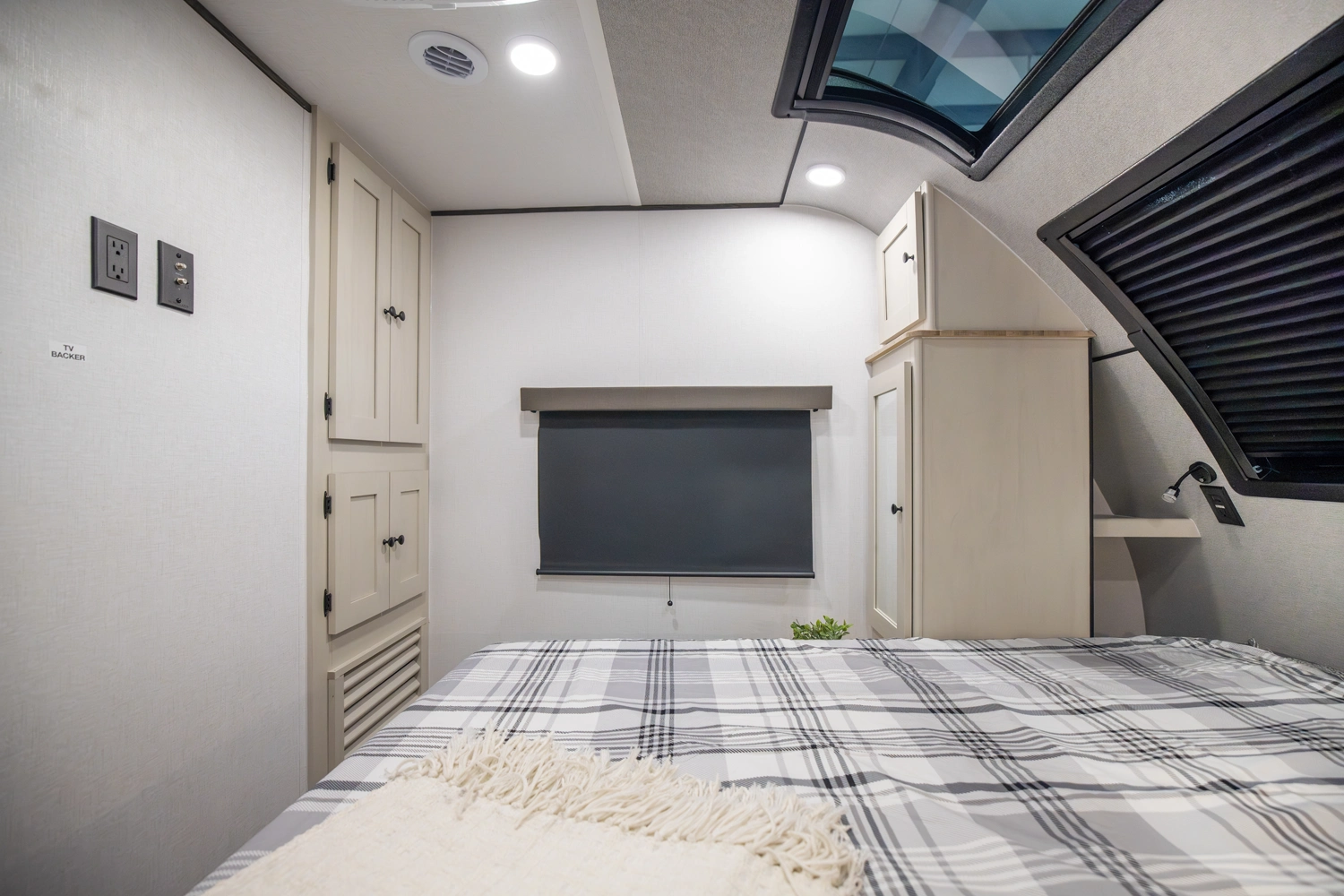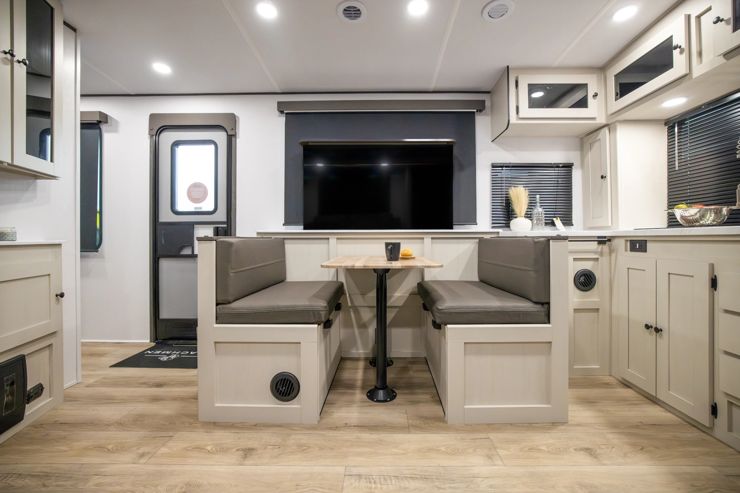 This couples coach comes in under 30 feet and right at 6000 lb. The living space includes a 50” TV on a televator directly across from your seating area. Tons of counter space, a floor to ceiling pantry, booth dinette, and an abundance of windows on the camp side make this a very popular couples coach.
