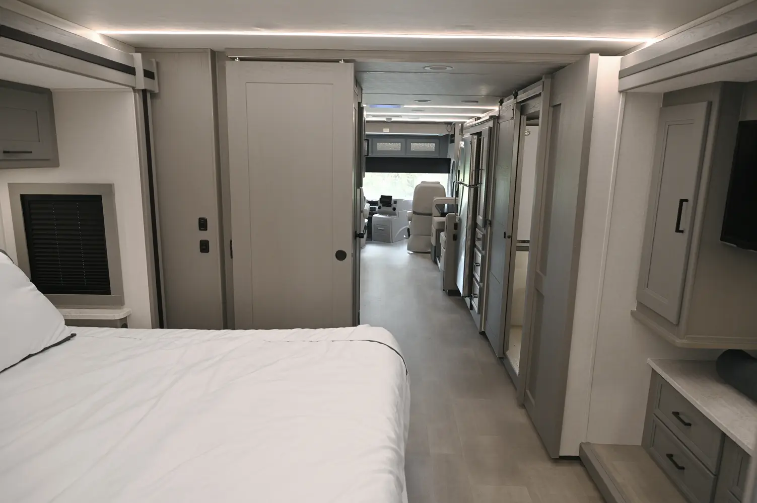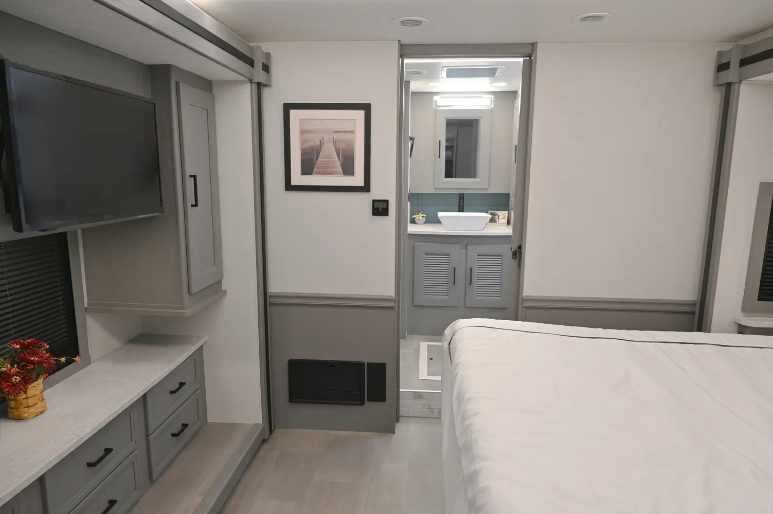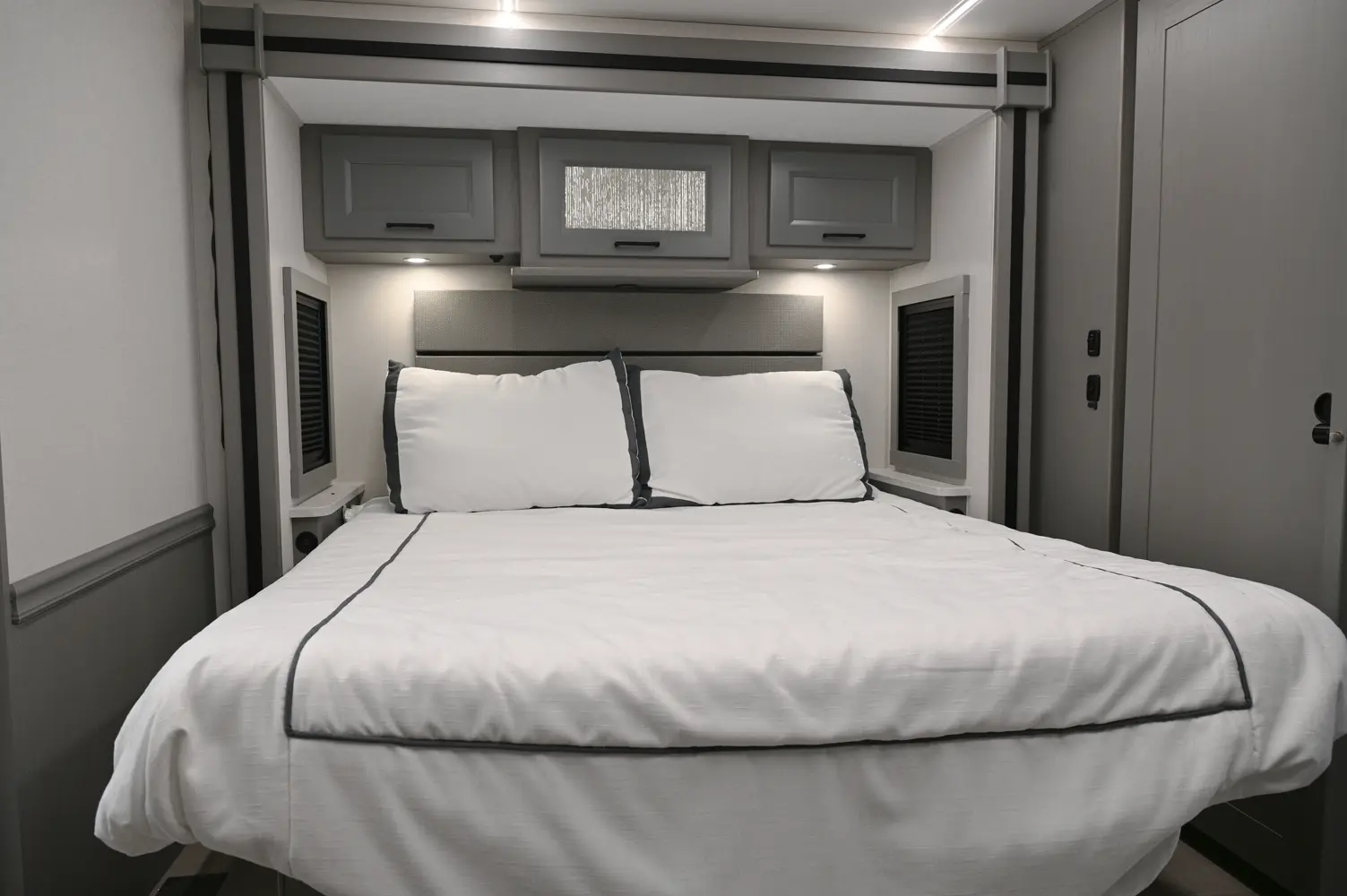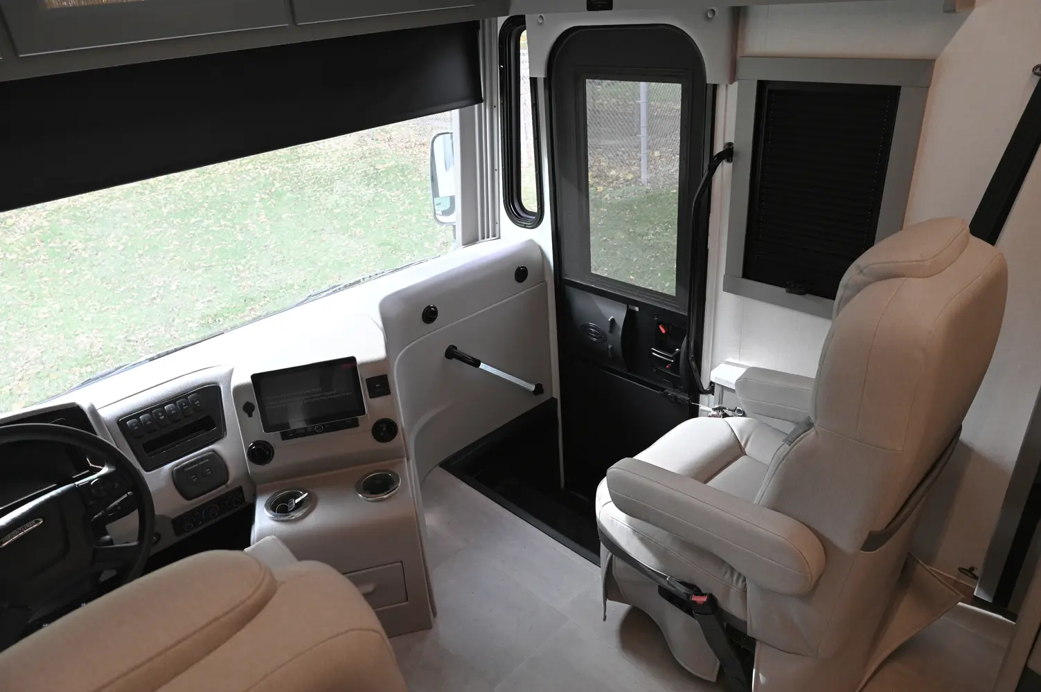 The Sportscoach RD 402TS delivers a powerful 41-foot diesel pusher ride built on a Freightliner raised-rail chassis. With air-ride suspension and panoramic windows, it offers a smooth journey through mountains, forests, or coastlines. Inside, the flat floor design and smart storage make it easy to bring all your gear. Premium finishes like solid-surface countertops and hardwood cabinetry provide refined comfort after long days of adventure.
